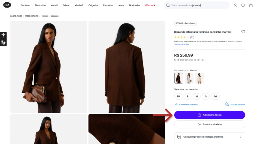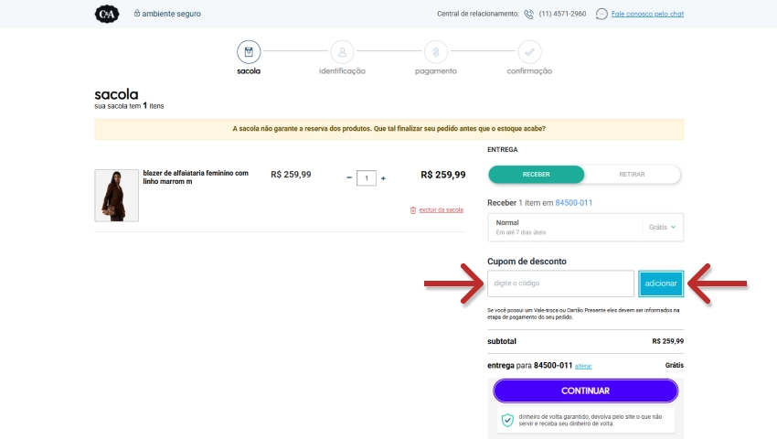 - No carrinho de compras, localize o campo “digite o código”, cole o cupom de desconto C&A e clique em “Adicionar“;