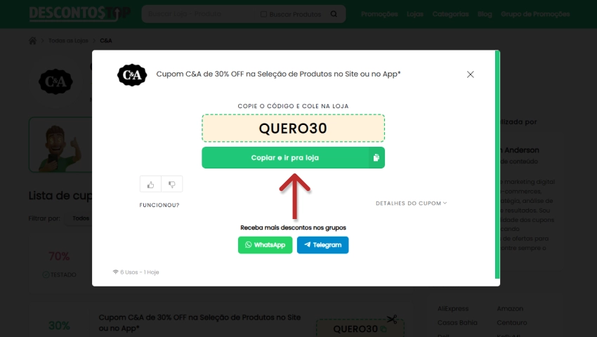 - Ao abrir a janela com o código, clique em “Copiar e ir pra loja” para copiar o cupom e ser direcionado automaticamente para o site oficial da C&A;