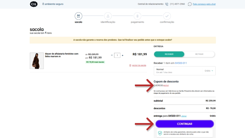 - Se o cupom for válido e atender aos requisitos, o código aparecerá no lugar do campo. Depois, clique em “CONTINUAR” para prosseguir com o checkout.