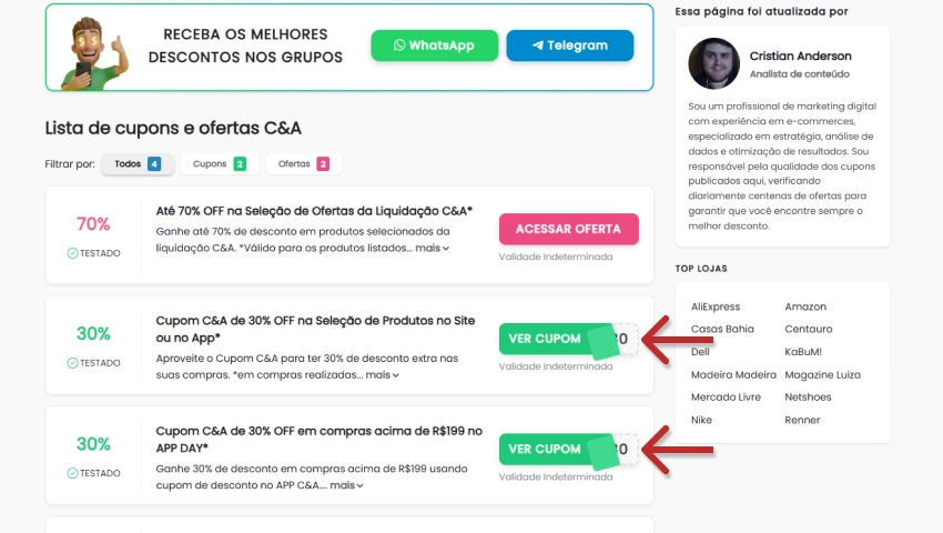- Na página de cupons da C&A no Descontos Top, veja os cupons disponíveis, selecione aquele que melhor se encaixa na sua compra e clique em “VER CUPOM“;